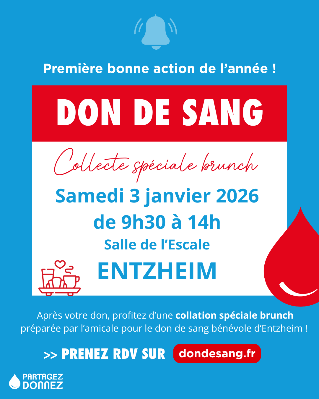 Rendez-vous le samedi 3 janvier 2026 à la salle des fêtes (accès par la rue des Sports) pour la prochaine collecte de sang.