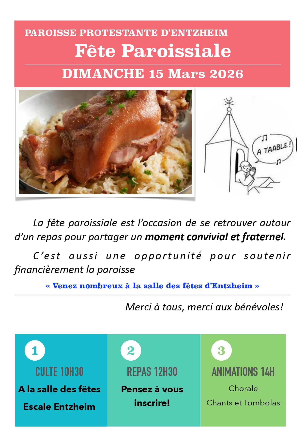 La paroisse protestante d’Entzheim vous convie à sa fête paroissiale le dimanche 15 mars 2026 à la salle des fêtes.