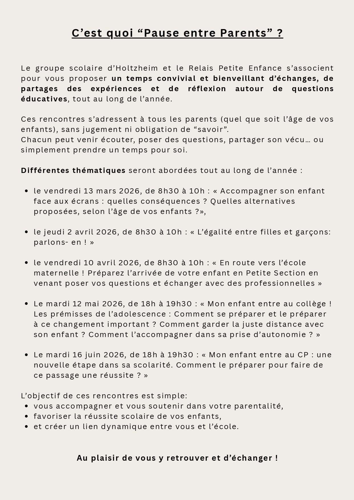 Rendez-vous le 13 mars à l’école maternelle de Holtzheim pour une rencontre/échange organisée par le Relais Petite Enfance (sur inscription) :
