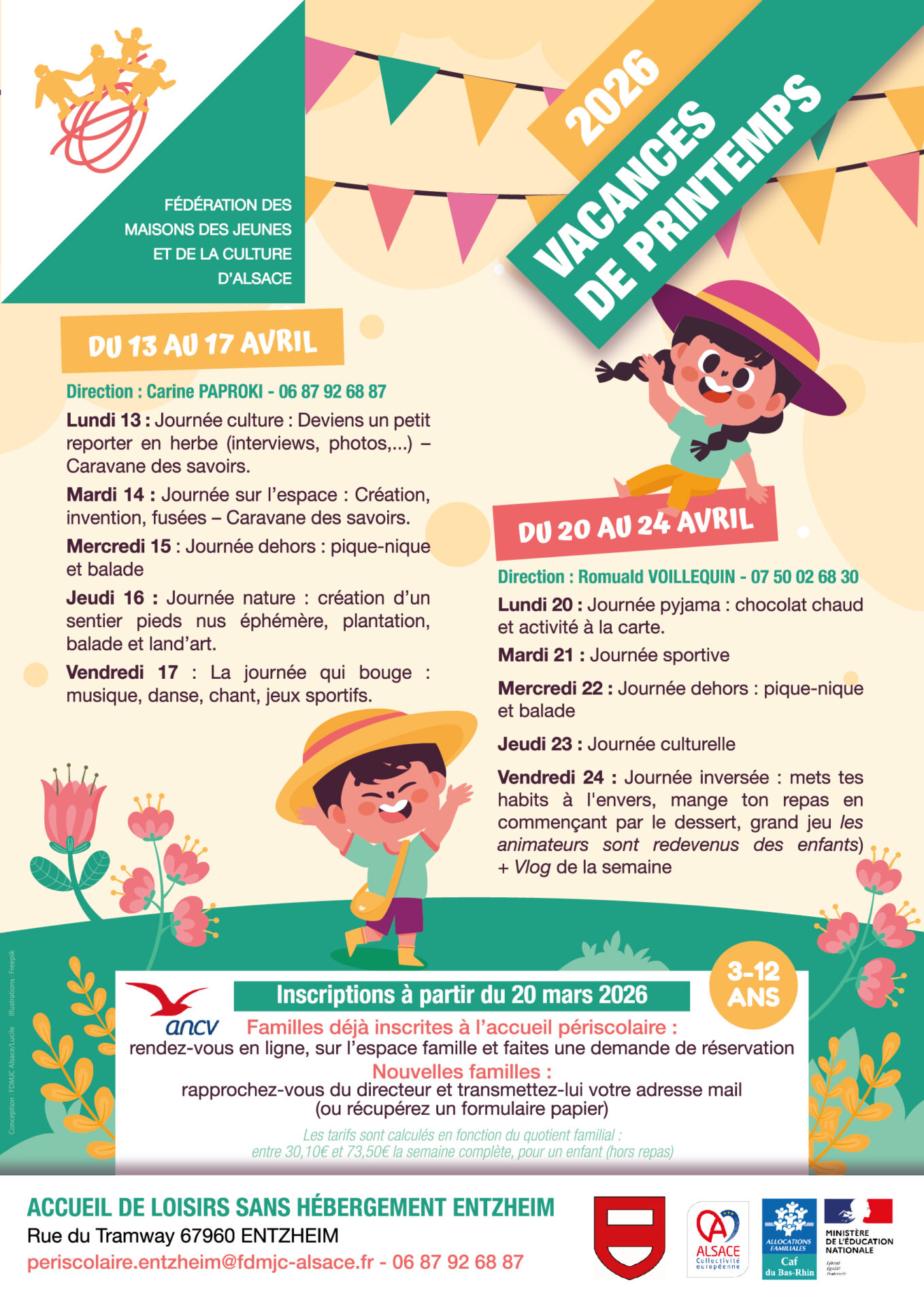 Le programme des vacances d’avril de l’Animation Jeunes d’Entzheim et celui du périscolaire sont désormais disponibles !